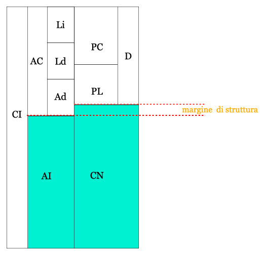 il margine di struttura (ms) dovrebbe mantenersi positvo poichè se la gestione è efficiente, l'impresa produce reddito che incrementa il capitale netto (CN) riuscendo ad ammortizzare le attività fisse (AI) che si riducono.