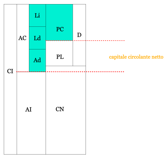 il capitale circolante netto (CCN) è particolarmente influenzato dalla giacenza media del magazzino (in Ad). In linea del tutto generale il suo valore dovrebbe essere pari al debito verso fornitori. Di fatto comprendendo anche i prodotti finiti il cui valore incorpora il costo del lavoro, il valore del magazzino sarà sempre maggiore del dei debiti verso fornitori dovendo così essere finanziato dalle passività a lungo (PL). Ne deriva che una buona gestione avrà un attivo corrente (AC) costantemente superiore al passivo corrente (PC).