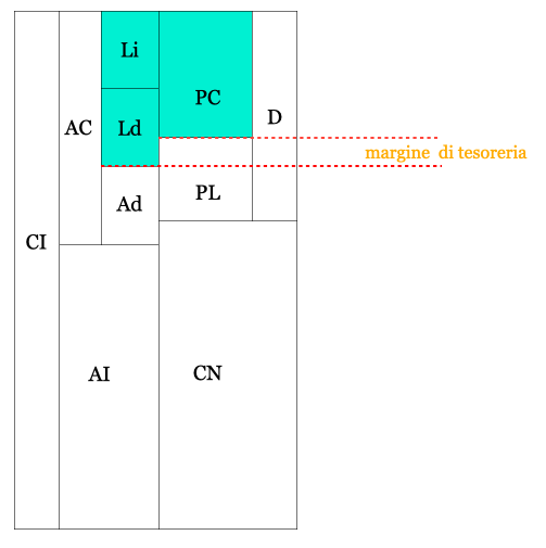 l'impresa dovrebbe sempre mantenere un margine di tesoreria (mt) positivo per essere in grado di far fronte ai debiti correnti (PC) con le risorse monetarie (Li) e le liquidità differite (Ld) come i crediti a breve.